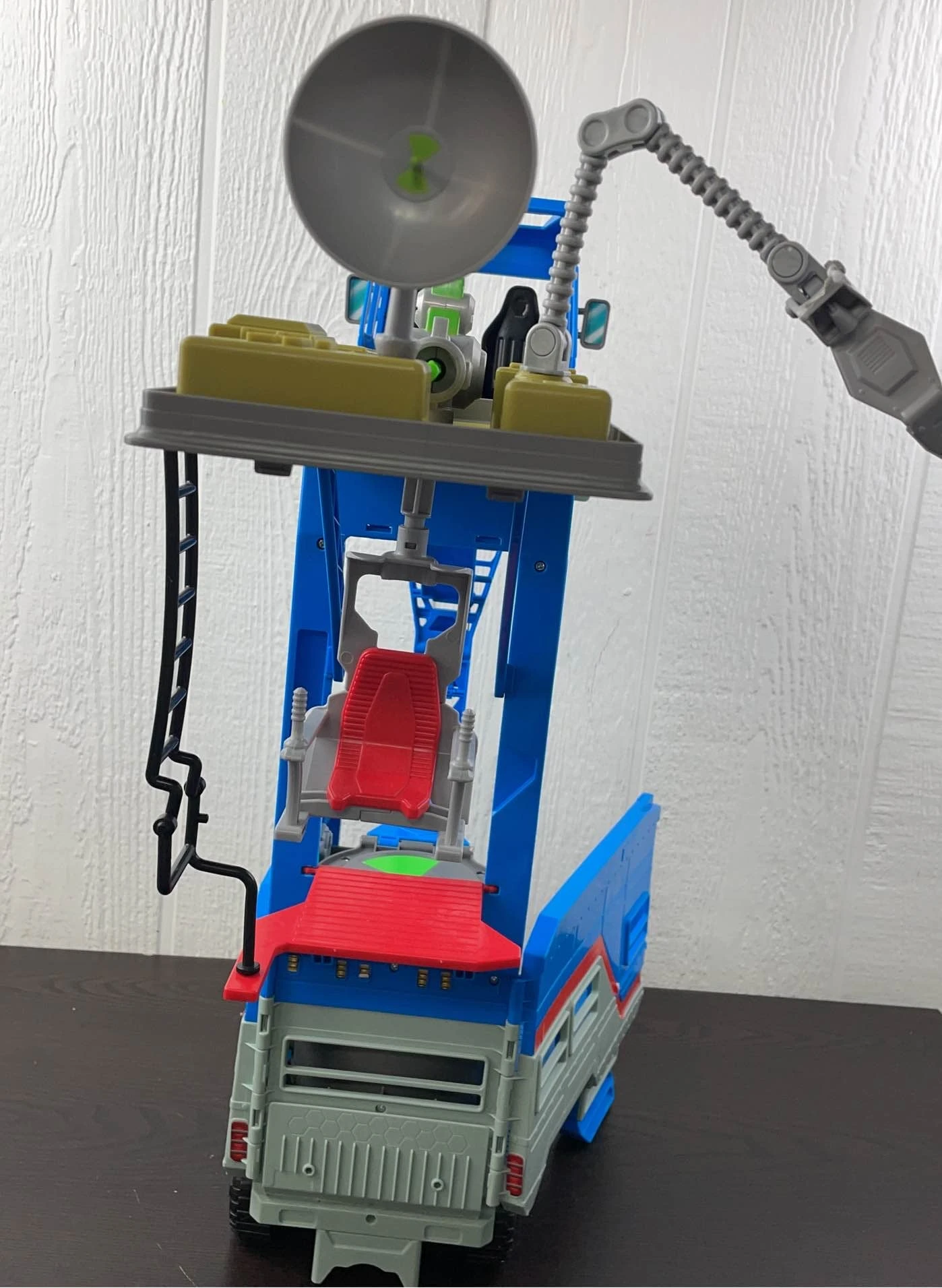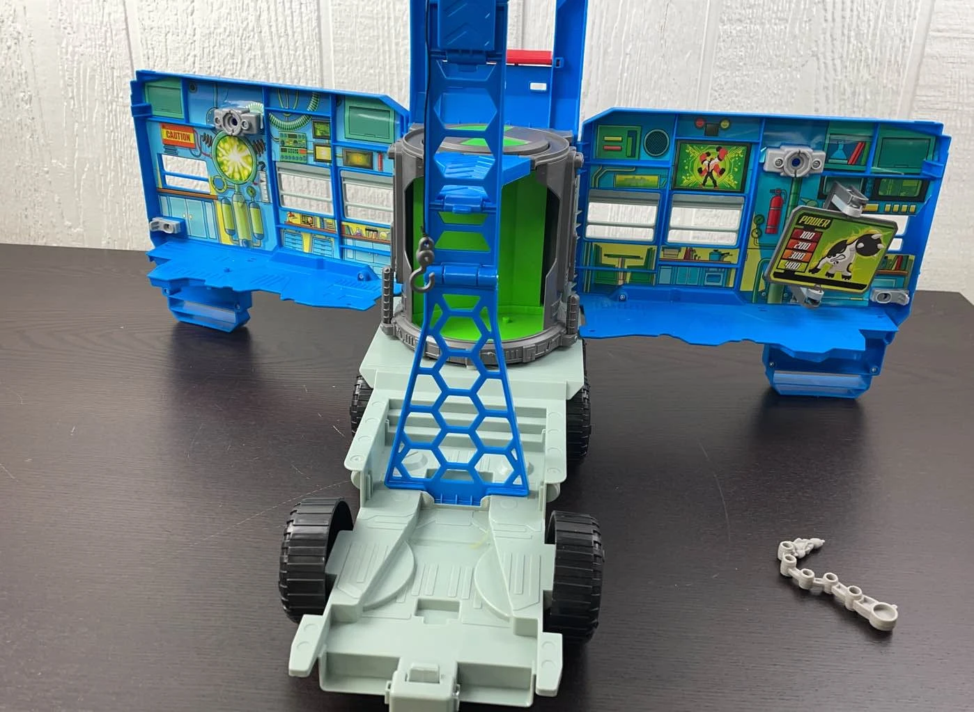 “This 2-in-1 playset transforms from a vehicle into a giant tower with three levels that is over 2 feet tall! Includes alien transformation chamber, grabbing claw, alien lab, and more!”