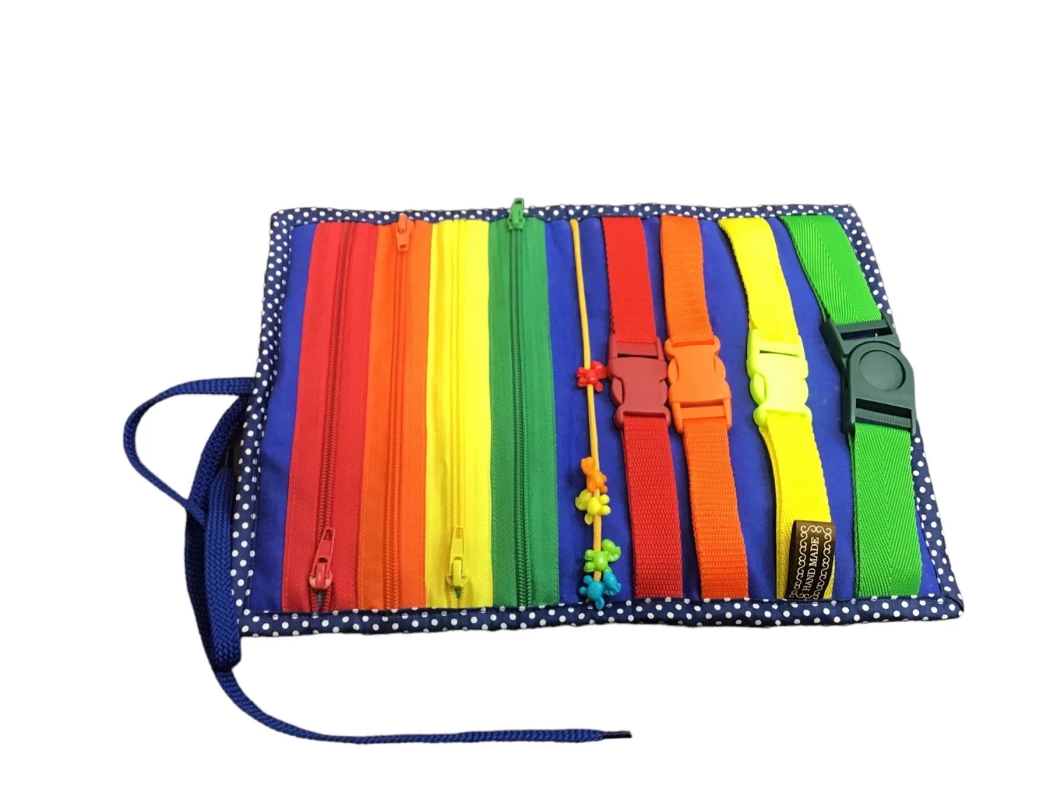 “Zip, snap, hook and latch the various items on this interactive busy board.”